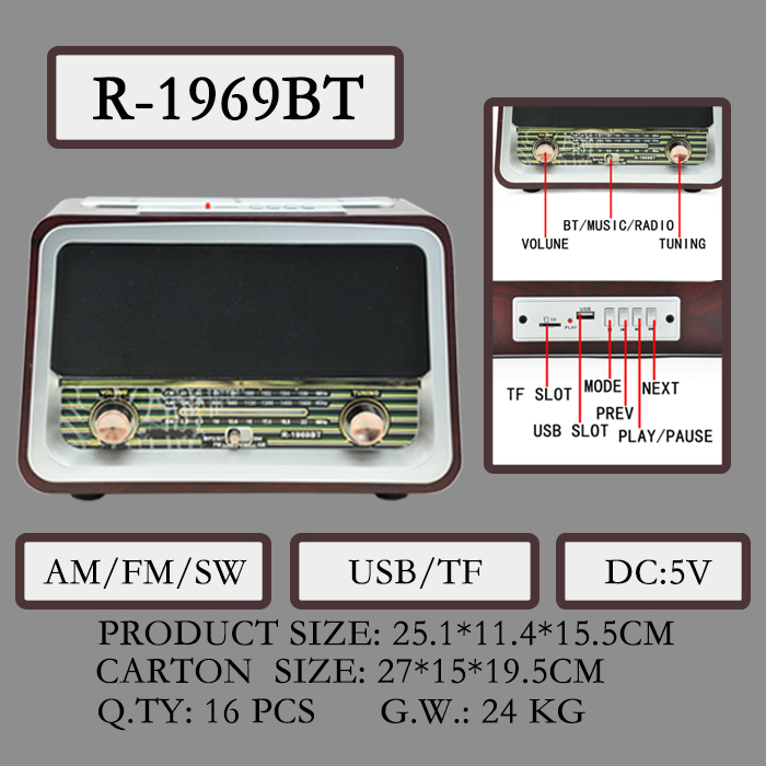 R-1969BT Portable Professional Classic Wooden 8 Inch Dual 15 Column Wireless Am Fm Sw Speaker With Radio